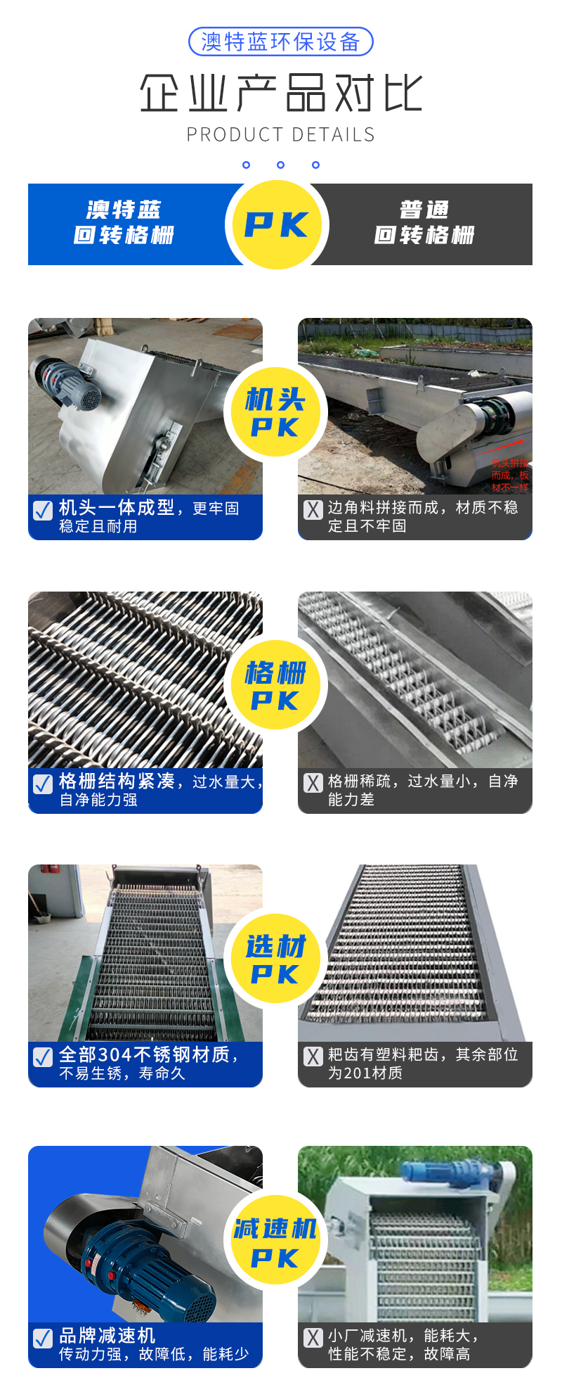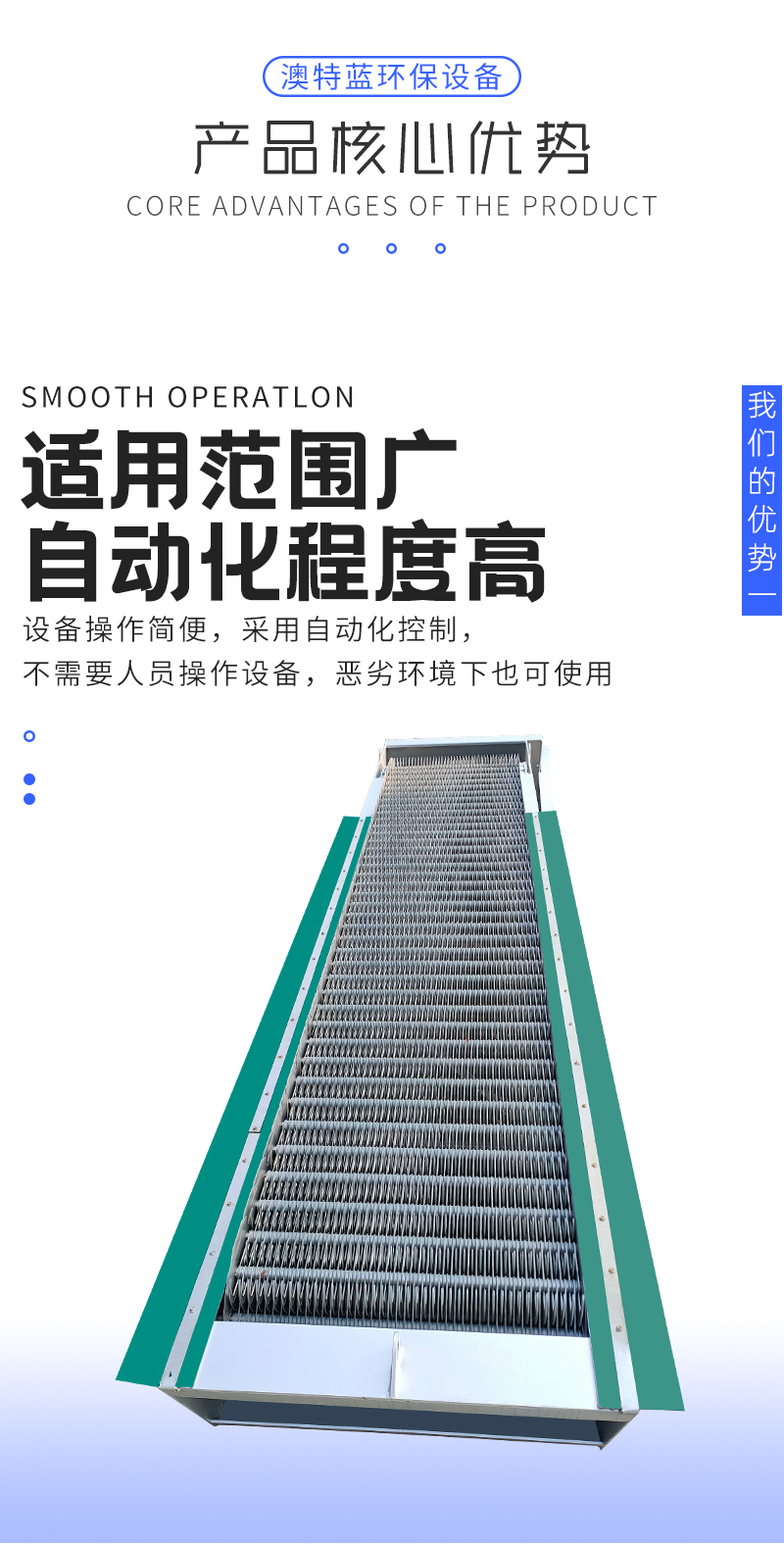 3、由于格柵機回轉(zhuǎn)鏈配帶多個除污齒耙,使得除污效率高,清污徹底;