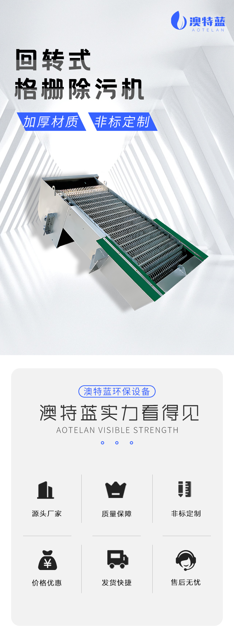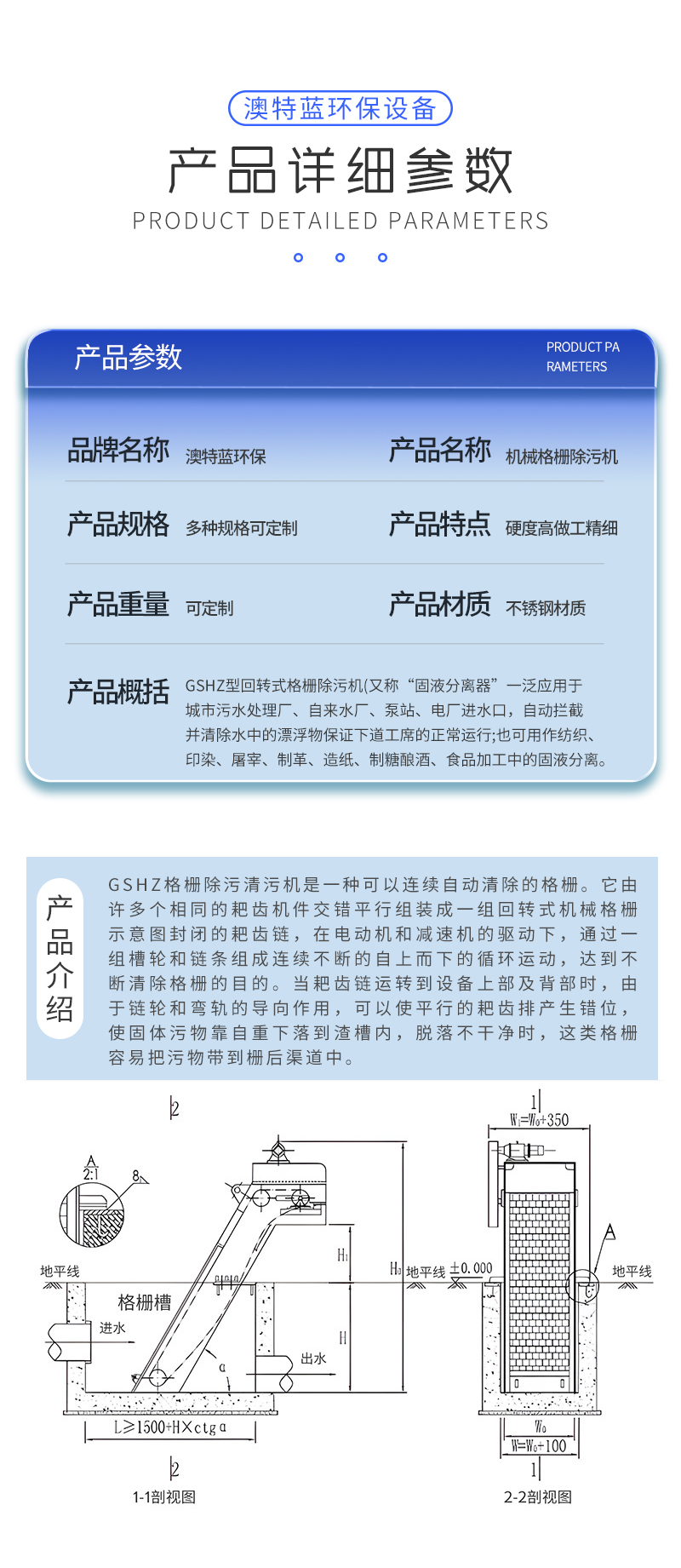 GSHP 型回轉(zhuǎn)耙式格柵除污機主要由驅(qū)動裝置、機架、主軸、柵條、托渣板、齒耙及牽引鏈組成。