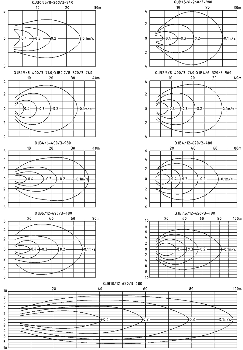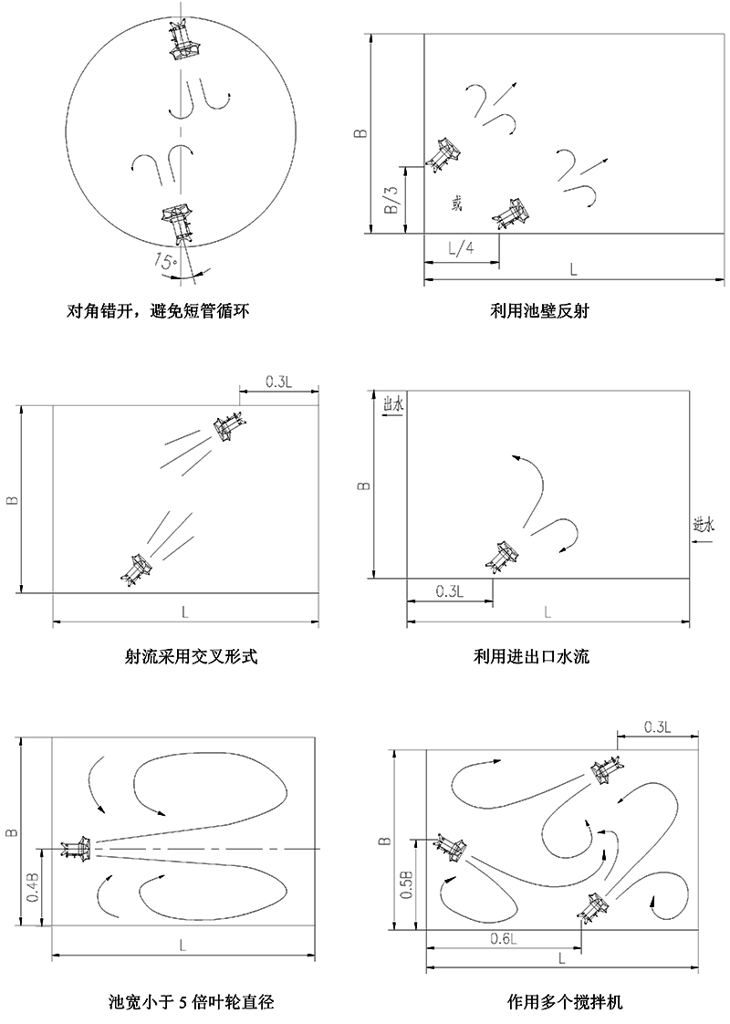 潛水?dāng)嚢铏C的選型是一項比較復(fù)雜的工作,選型的正確與否直接影響設(shè)備的正常使用,作為選型的原則就是要讓攪拌機在適合的容積里發(fā)揮充分的攪拌功能,一般可用流速來確定。根據(jù)污水處理廠不同的工藝要求,攪拌機最佳流速應(yīng)保證在 0.15~0.3m/s 之間,如果低于 0.15m/s 的流速則達不到推流攪拌效果,超過0.3m/s 的流速則會影響工藝效果且造成浪費。所以在選型前首先確定潛水?dāng)嚢铏C運用的場所,如:污水池、污泥池、生化池;其次是介質(zhì)的參數(shù),如:懸浮物含量、粘度、溫度、PH 值;還有水池的形狀、水深等。