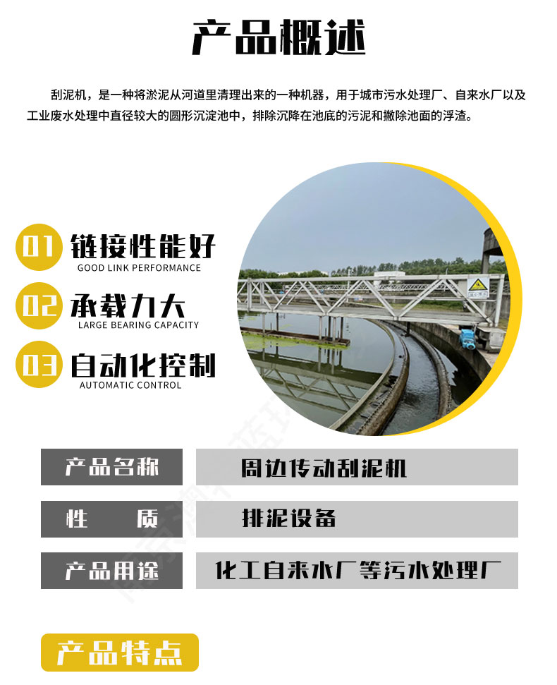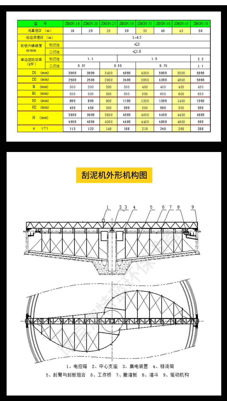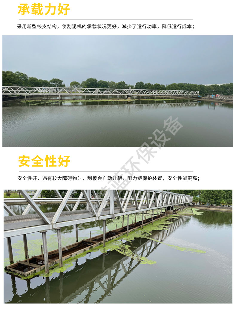 ZQXN 型周邊傳動全橋式吸泥機用于污水處理廠圓形二沉池,將沉降在池底的污泥刮集至一組沿半向布置的吸泥管管口,再通過中心排泥管排出,以便污泥回流或濃縮脫水,同時將池面的浮渣撒向集用途:通過集渣斗排出池外,以便進一步處理。